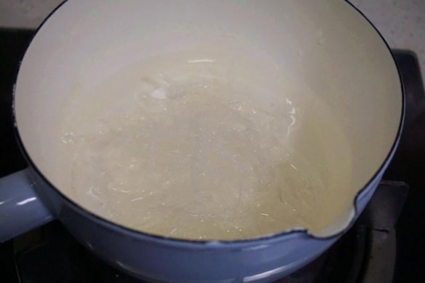 3、燒開后轉(zhuǎn)小火,放入瓊脂,繼續(xù)煮2-3分鐘,煮的時候不斷攪拌,直到瓊脂完全融化,這時關(guān)火。