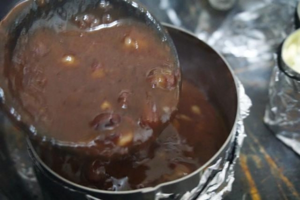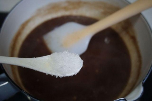 7、放入粘稠的豆粥(豆沙餡也行,那就不要放糖了),攪拌均勻后就關(guān)火。