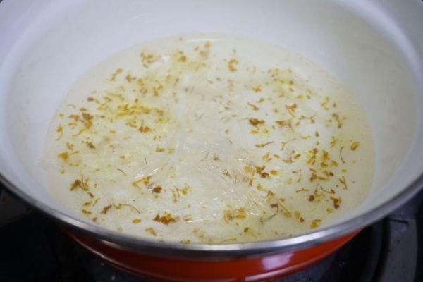 2、先來做水晶桂花羹,在鍋里倒入水和糖桂花,燒開。