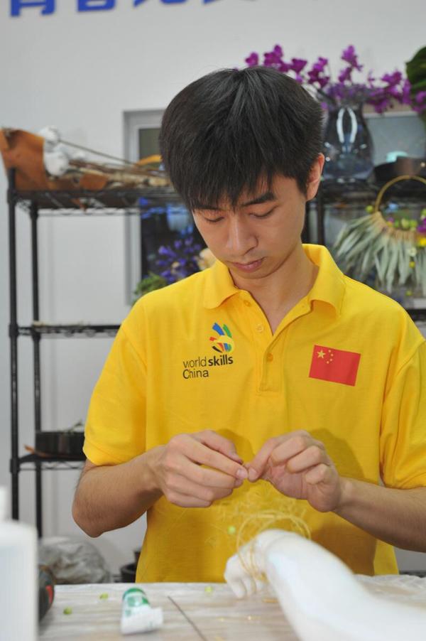 在第44屆世界技能大賽上,潘沈涵參加花藝項目。