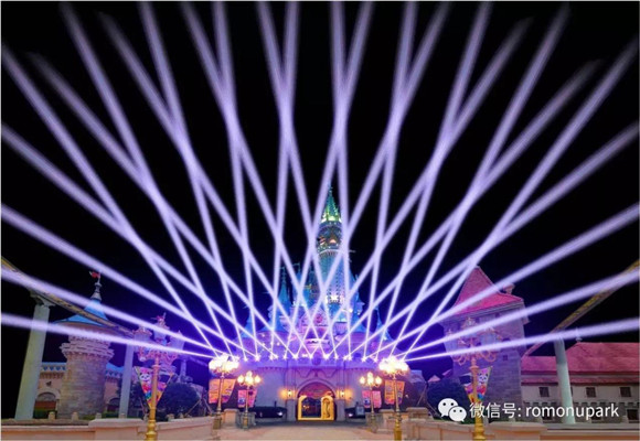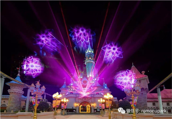 激光燈閃耀全城,光影交織,絢麗非凡。夢幻城堡、音樂繚繞、水光輝映多種表演元素交匯,羅蒙環(huán)球樂園猶如一朵鮮花在甬城的高空冉冉綻放…