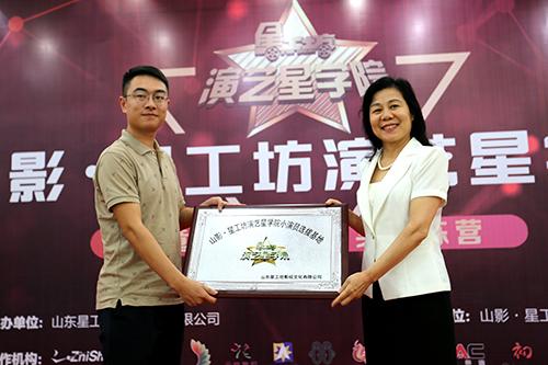 山東星工坊影視文化有限公司副總經(jīng)理趙霞為泰安電視臺小敢當(dāng)藝術(shù)團(tuán)頒發(fā)“山影·星工坊演藝星學(xué)院小演員選拔基地”牌匾。