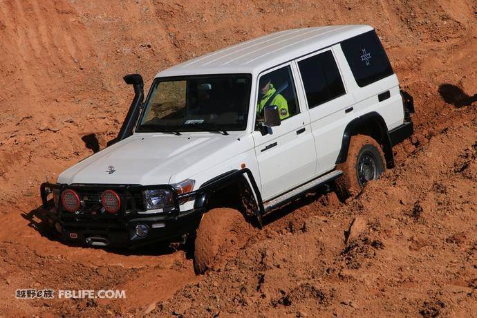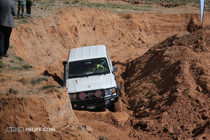 車(chē)隊(duì)中還有一輛LC76作為工作車(chē),看到如此復(fù)雜的賽道,忍不住下去體驗(yàn)了一把。在最開(kāi)始的炮彈坑路段,加裝了前后差速鎖的LC76順利通過(guò),不過(guò)到了我們布置的“熱巧克力的誘惑”,與之前體驗(yàn)的車(chē)輛一樣,在這里折戟。最后同樣在挖掘機(jī)的幫助下脫困,之后的起伏路沒(méi)有難住接近角離去角巨大的它,終極挑戰(zhàn)爬坡,LC76用充沛的動(dòng)力穩(wěn)健的爬到了坡頂。