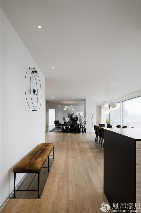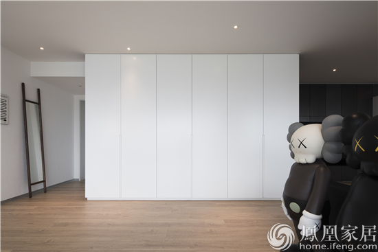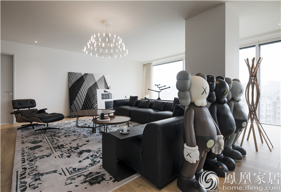 橫廳中兩個(gè)立柱為原始空間結(jié)構(gòu),在空間劃分上是頗為棘手的設(shè)計(jì)難點(diǎn)。因此,設(shè)計(jì)師方磊利用定制拐角沙發(fā)巧妙圍合立柱形成客廳。清透的薄紗窗簾可依據(jù)生活場(chǎng)景靈活調(diào)整,室內(nèi)光線也隨之變化。沙發(fā)旁擺放的限量版KAWS玩偶無(wú)疑能讓客廳增加趣味性與靈動(dòng)感,不經(jīng)意間彰顯業(yè)主個(gè)人風(fēng)格和品位。
