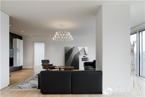 由玄關(guān)入室,便可直觀感受空間開(kāi)闊。偌大的落地窗盡攬四周美景,強(qiáng)調(diào)入戶第一觀感。設(shè)計(jì)師弱化區(qū)域結(jié)構(gòu)與色彩,通過(guò)一組白色Flos吊燈恰到好處地將虛實(shí)關(guān)系勾勒出來(lái)。