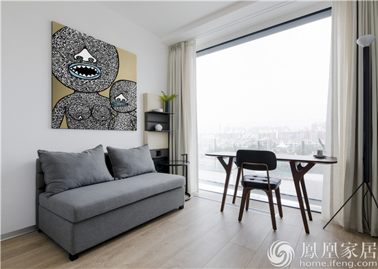 女主人的工作室內(nèi),一張書(shū)桌臨窗而立,輕透的空間讓人思緒得以放松和平靜。沙發(fā)床的布置頗具匠心,可供親朋好友短暫居住。設(shè)計(jì)師通過(guò)不同家私間的搭配,調(diào)和空間所帶來(lái)的生活體驗(yàn),感官上簡(jiǎn)潔利落,同時(shí)女主人的細(xì)膩與熱情都融在這方小天地中。