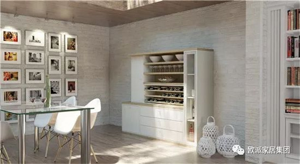 餐邊柜下部鏤空,可用作酒吧,上部柜可作展示之用;中部臺(tái)面可放置湯鍋、電飯鍋。