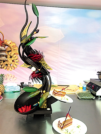 巧克力制作的甜品臺造型逼真。