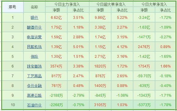 根據(jù)行業(yè)板塊資金流向統(tǒng)計(jì)表觀察可以看出:今日行業(yè)資金凈流入最多的行業(yè)是銀行板塊,主力資金凈流入6.62億元。其次是釀酒板塊,主力資金凈流入1.75億元,電信運(yùn)營(yíng)行業(yè)主力資金凈流入1.59億元,民航機(jī)場(chǎng)資金凈流入1.39億元。從個(gè)股資金流向來(lái)看,獲得主力資金凈流入排名前十情況如下: