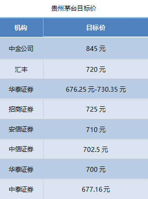 此次貴州茅臺三季度公布后,機(jī)構(gòu)再度上調(diào)目標(biāo)價。中金公司上調(diào)貴州茅臺的目標(biāo)價至845元,匯豐上調(diào)目標(biāo)價至720元,華泰證券上調(diào)目標(biāo)范圍至676.25元-730.35元,招商證券上調(diào)至725元,安信證券上調(diào)至710元,中信證券上調(diào)至702.5元,華泰證券上調(diào)至700元,中泰證券上調(diào)至677.16元,并稱市值“劍指萬億”。