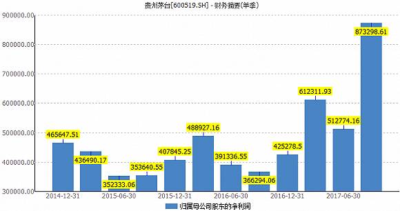 2016年貴州茅臺全年實現(xiàn)營業(yè)收入401.55億元,實現(xiàn)凈利潤167.18億元。而公司2017年前三季度的營收、凈利潤便已經(jīng)超過了去年全年。