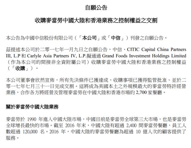 中信股份曾于今年1月9日公告,中信集團旗下的中信股份、中信資本控股、凱雷投資集團和麥當(dāng)勞聯(lián)合宣布達成戰(zhàn)略合作并成立新公司,新公司將以最高20.8億美元(約161.4億港元)的總對價收購麥當(dāng)勞在中國內(nèi)地和香港的業(yè)務(wù)。