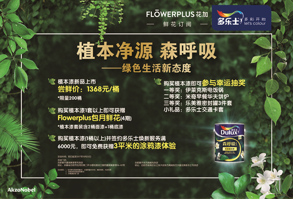 \u00A0即日起,至門店購買多樂士植本漆一組,即可獲贈FlowerPlus包月鮮花一份,每周一束,整整四周的綠色相伴送到家!進入指定多樂士門店,掃描二維碼,即可獲價值30元花加鮮花訂閱抵用券。