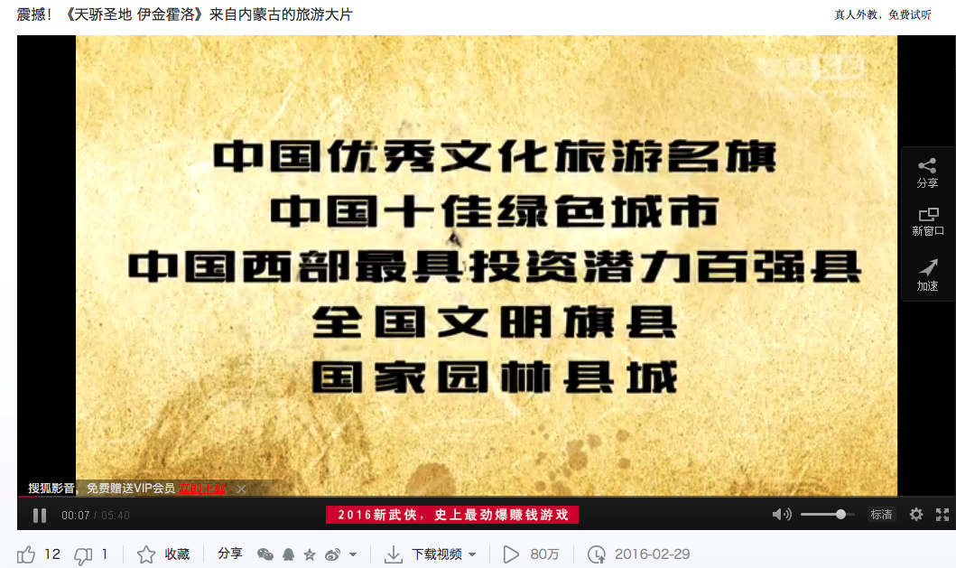 3月1日,來自一代天驕成吉思汗長眠地內蒙古伊金霍洛旗的旅游形象大片以“震撼!《天驕圣地伊金霍洛》來自內蒙古的旅游大片”為標題,在優(yōu)酷視頻、騰訊視頻、 搜狐視頻、新華社客戶端等全國各大視頻網站同步播出,播出以來受到全國3068萬網友點播觀看,全國眾多網絡媒體兩次密集發(fā)布新聞,報道來自內蒙古的這一旅游大片,全國上百家論壇發(fā)布信息,上百家微博,微信同步直播,發(fā)布信息。《天驕圣地 伊金霍洛》旅游大片的推出讓更多的人了解內蒙古伊金霍洛旗歷史文化和特色景觀,也從不同的側面展示了伊金霍洛的文化旅游魅力。