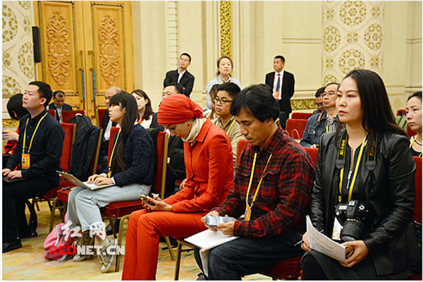 10月19日十九大湖南代表團媒體開放日上,馨玥(前右三)參加了湖南團的采訪。