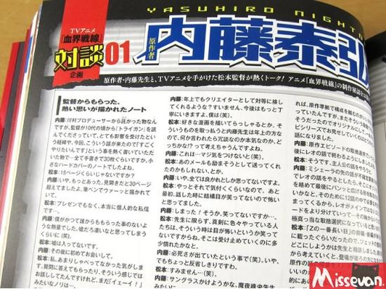 《血界戰(zhàn)線 官方粉絲本 B5》通常版/DVD同捆版于6月1日在秋葉原發(fā)售。《JUMP SQ》的編輯部發(fā)推告知:“只用一本書就能完整介紹原作和動畫!”從前面開始看的話就是原作漫畫,后面開始看的話就是TV動畫的內(nèi)容,原作漫畫篇是第一次 被收錄的2008年的單篇版本。(單篇:是指漫畫或小說等文學(xué)刊行一次就完結(jié)的非連載作品。)