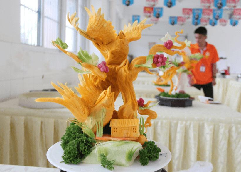 高志明,廣州新東方烹飪學(xué)校參賽教師,擅長(zhǎng)雕刻及涼菜制作。作品主體取用南瓜,靈性有神的飛鳥造型欲翩翩翱翔,將游子的一片相思之情遙寄千里之外的家人。