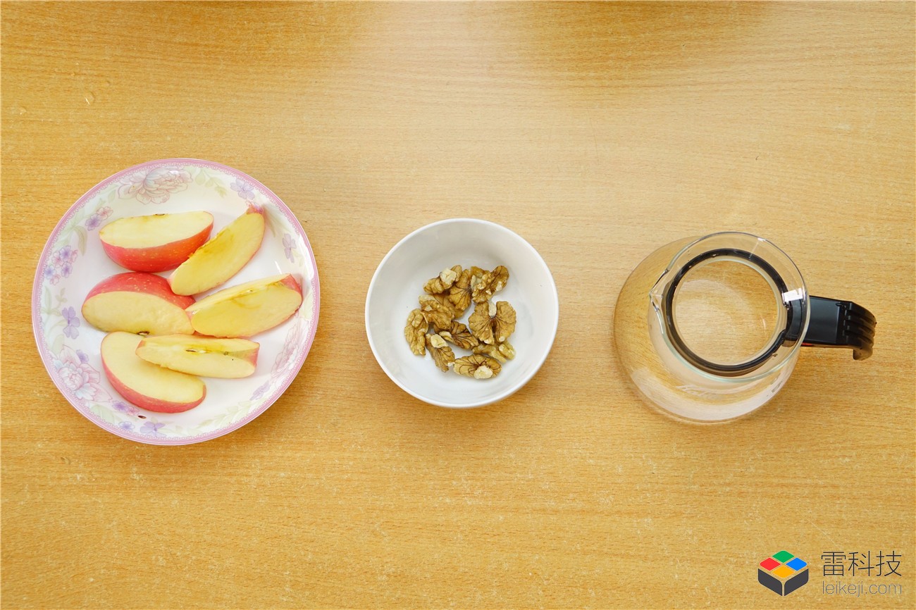 接著再來看下這臺機器做果汁的效果,準備的材料有蘋果、核桃、水,像核桃這種堅硬的堅果,以及沒有去核去皮的蘋果,如果這兩種材料可以充分研磨,那么基本大部分“果汁”都能勝任。