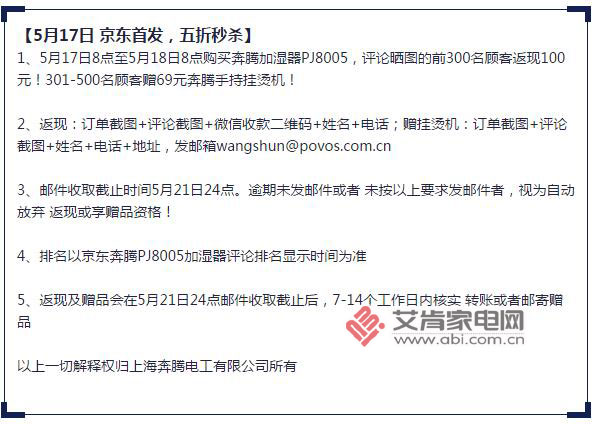 有了各種前沿技術(shù)的加碼,新品價格自然會貴一些,相信這也是不少消費(fèi)者的顧慮,但此番PJ8005加濕器的上市,POVOS奔騰想打破這一魔咒,想把上加水這一創(chuàng)新產(chǎn)品,普及給更多消費(fèi)者。只需在5月17日上午8點(diǎn)京東首發(fā)前,提前預(yù)約,即可享五折優(yōu)惠!而且,凡是在首發(fā)當(dāng)天、24小時之內(nèi)搶購,評論曬圖的前300名顧客均可返現(xiàn)100元,301-500名的顧客可贈69元奔騰手持掛燙機(jī)!