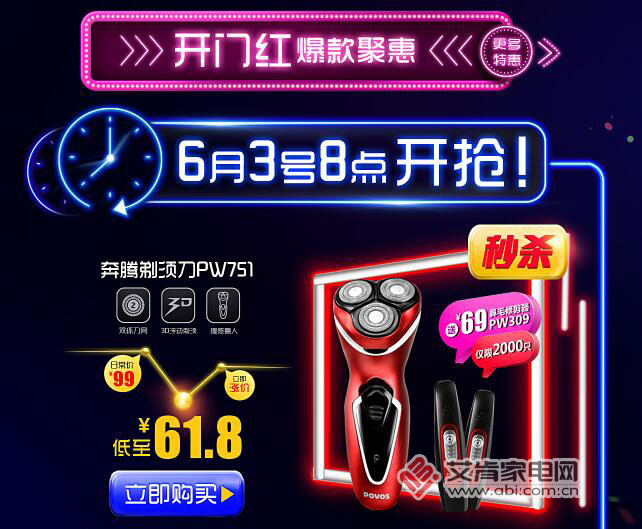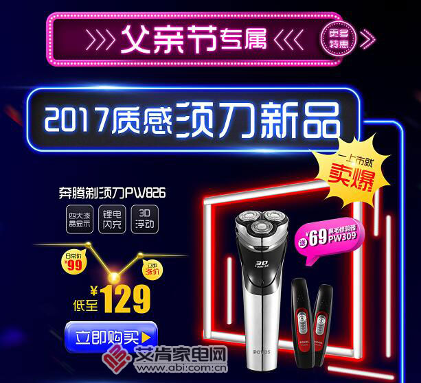 比如:契合618節(jié)點(diǎn),從99元降至61.8元(前2000名搶購(gòu)者還另送價(jià)值69元鼻毛修剪器)的秒殺款剃須刀PW571,盡管價(jià)格抄底,但雙環(huán)刀網(wǎng)和3D浮動(dòng)等技術(shù)一樣都不少;還有一上市就賣爆的熱銷款剃須刀PW831、熱銷款電吹風(fēng)PH9032、熱銷款加濕器PJ8002、熱銷款掛燙機(jī)PW535,均降至歷史的最低價(jià),分別為69元、65元、99元和139元;青少年寵愛的高性價(jià)比剃須刀PW930,更是降至39.9元的秒殺價(jià);另外,當(dāng)618撞上父親節(jié),POVOS奔騰還特別推出了父親節(jié)專屬的新款剃須刀PW826,擁有極具質(zhì)感的液晶顯示屏,鋰電閃充、3D浮動(dòng)技術(shù)的加持,讓送禮更加有面兒……