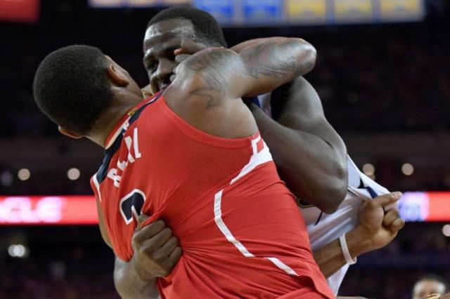 兩人在籃底下爭搶籃板卡位時肢體動作過大,比爾卡位不成功,卻順手一個右勾拳打到格林的臉上。大膽!追蛋格林你也敢惹!格林蓄怒1秒,瞬間爆發,兩人抱在一起就是一段充滿力量的華爾茲。這畫面,這攝影技術,攝影師沒去排愛情片真的的浪費了,一個打斗場面,居然被拍的基情滿滿!大寫的服!