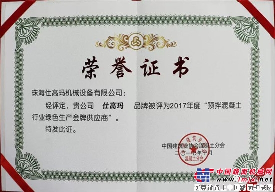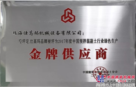 珠海仕高瑪公司憑借著其“低能耗、低噪音、高效率”的產品性能和優良的攪拌機品質在本次大會上榮獲“2017年度預制混凝土行業綠色生產金牌供應商”。