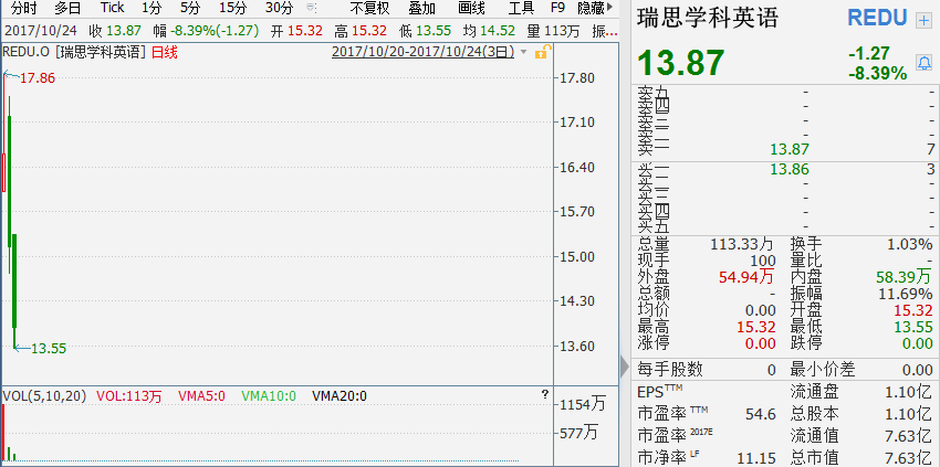 鳳凰網(wǎng)財經(jīng)訊 美股開盤,中概股瑞思學科英語高開后大幅跳水,截止發(fā)稿,瑞思學科英語大跌逾8%,報13.87美元/股,跌破14.5美元/股的發(fā)行價。瑞思學科英語于10月21日登陸納斯達克,股價已連續(xù)兩天下 鳳凰網(wǎng)財經(jīng)訊 美股開盤,中概股瑞思學科英語高開后大幅跳水,截止發(fā)稿,瑞思學科英語大跌逾8%,報13.87美元/股,跌破14.5美元/股的發(fā)行價。瑞思學科英語于10月21日登陸納斯達克,股價已連續(xù)兩天下跌。 瑞思教育走勢 \u00A0