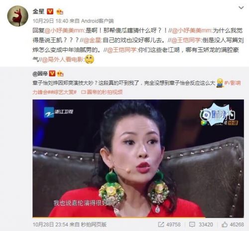 -近日,疑嘲諷章子怡演技引發(fā)關(guān)注。這事情跟最近劉燁怒摔手機(jī)上熱搜有關(guān)!究竟是怎么一回事呢?原來(lái)是金星在轉(zhuǎn)發(fā)網(wǎng)友微博后,懟道“自己的戲也沒(méi)好到哪兒去?”對(duì)于金星此句模棱兩可的話(huà),更是遭到網(wǎng)友猜忌。由此大作文章。不過(guò)金星顯然不是表達(dá)這個(gè)意思。那么這句話(huà)究竟有什么含義?