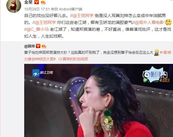就在這一出戲引來無數(shù)網(wǎng)友圍觀的時(shí)候,已經(jīng)退出江湖的金星又來湊熱鬧!在其轉(zhuǎn)發(fā)的微博中怒懟到:自己的演技也沒有好到哪里去!這一句模棱兩可的話,立即引來了多方猜疑!