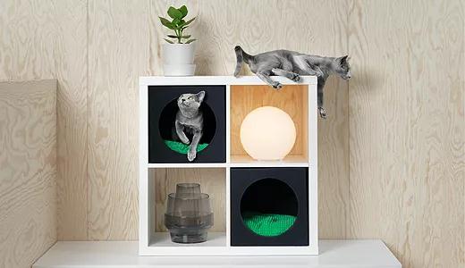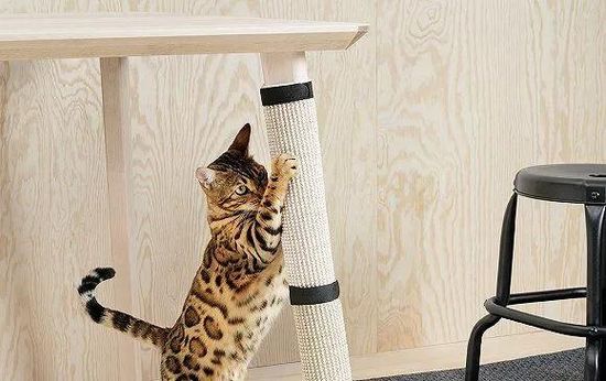 比如,Lurvig系列中的貓窩就還能用做一組儲(chǔ)物柜。不過(guò),這可能需要你家的貓不愛(ài)摔東西,可以綁到桌椅腿上的貓抓墊也如此。這類設(shè)計(jì)既節(jié)約空間,又容易收納,不用時(shí)可以折疊保存。