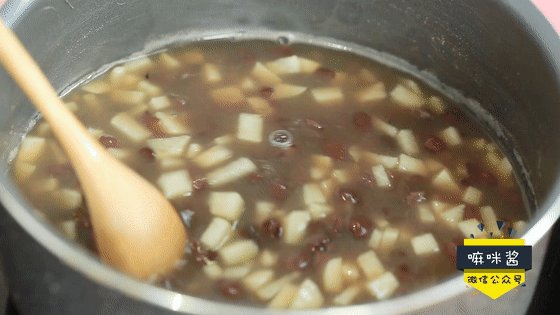 芋艿倒入紅豆湯中攪拌均勻。