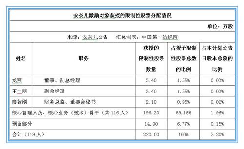 根據(jù)《計(jì)劃》,安奈兒決定對(duì)119名在公司任職的董事、高級(jí)管理人員、核心管理人員,核心業(yè)務(wù)(技術(shù))骨干授予為限制性股票,《計(jì)劃》首次授予的限制性股票的授予價(jià)格為16.45元/股,限制性股票數(shù)量為220萬股,占該激勵(lì)計(jì)劃草案公告時(shí)公司股本總額10,000萬股的2.20%。其中,首次授予205.10萬股,占該激勵(lì)計(jì)劃草案公告時(shí)公司股本總額1億股的2.05%;預(yù)留14.90萬股,占該激勵(lì)計(jì)劃草案公告時(shí)公司股本總額1億股的0.15%,預(yù)留部分占本次授予權(quán)益總額的6.77%。