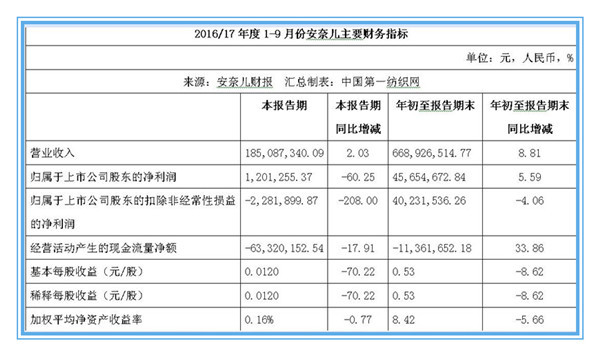 第一紡織網(wǎng)10月25日消息(記者martin報道):6月1日正式登陸深交所的“童裝第一股”深圳市安奈兒股份有限公司(以下簡稱“安奈兒”),10月24日晚間發(fā)布其上市后的2017年前三季度業(yè)績報告,數(shù)據(jù)顯示,報告期內(nèi),公司實(shí)現(xiàn)營業(yè)收入6.69億元,與上年同期相比增長8.81%%,歸屬于上市公司股東的凈利潤4565.47萬元,與上年同期相比增長5.59%,基本每股收益0.0120元/股。