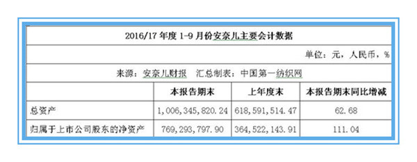 截止報告期末,安奈兒總資產(chǎn)達(dá)到10.06億元,與上年同期相比增長62.68%。