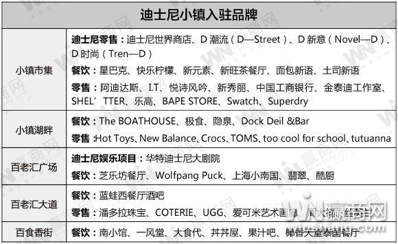 迪士尼自營品牌中,D潮流、D新意、D時尚主要提供迪士尼服飾、藝術品、飾品及數碼周邊產品;華特迪士尼大劇院是整個小鎮內唯一的娛樂項目,迪士尼電影系列首映均將在此舉行;甜蜜滿勺則會根據季節和節日的不同,制作不同造型的糖果,門店風格較為清新。