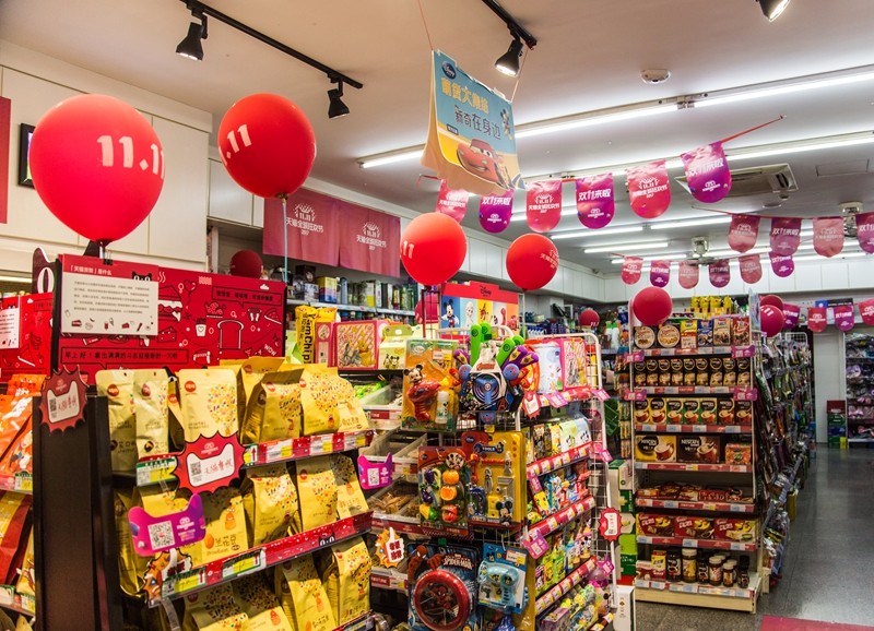 第二天,我來到了李爸爸說的這家小店,進門就看到了顯眼的兩個天貓貨架。