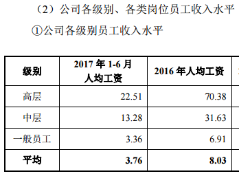 根據(jù)招股書第78頁(yè)披露的信息,好太太各層級(jí)員工2017年上半年的平均薪酬,均不足2016年全年金額的一半。其中高層員工2017年上半年的平均薪酬為22.51萬(wàn)元,僅相當(dāng)于2016年全年薪酬70.38萬(wàn)元的30%左右;中層員工2017年上半年的平均薪酬為13.28萬(wàn)元,僅相當(dāng)于2016年全年薪酬31.63萬(wàn)元的42%左右;就連薪水本就不高的基層員工,2017年上半年的平均薪酬為3.36萬(wàn)元,也不足2016年全年薪酬的一半。