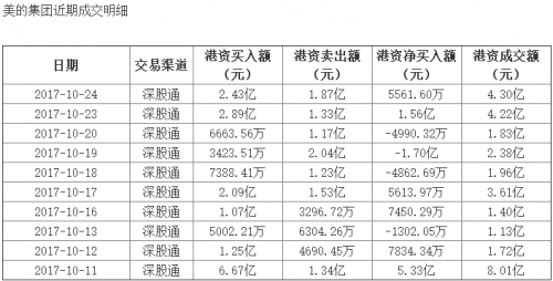 10月24日,美的集團(tuán)再度現(xiàn)身深股通十大成交活躍股,位居深股通港資成交額第1位。