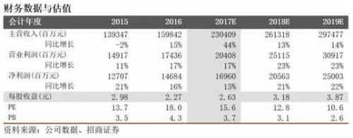 招商證券家電團(tuán)隊(duì)預(yù)計(jì),外資(QFII和深港通)持股美的占比已經(jīng)超過20%,對企業(yè)估值的影響力已經(jīng)十分顯著。若以2017年盈利為參考分部估值(大家電+小家電+機(jī)器人),我們認(rèn)為美的的合理市值區(qū)間為3000~3400億(對應(yīng)2017年17.8-20xPE)。預(yù)計(jì)公司2017將實(shí)現(xiàn)15%左右盈利增長,2018將實(shí)現(xiàn)20%以上增長。