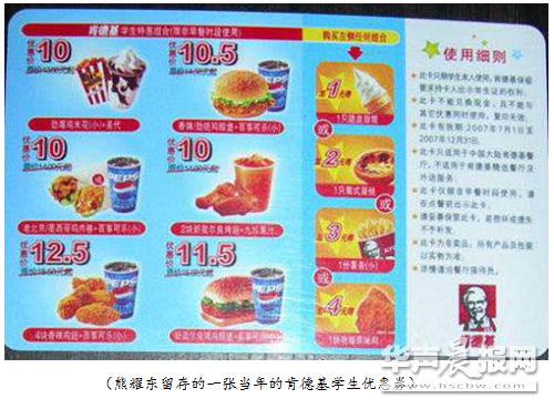 “推開門的那一刻,我整個人都嚇壞了”,談起第一次走進“洋鄰居”肯德基時熊耀東說道,“十幾個服務員沖著我們說‘歡迎光臨’,把我們帶到點餐臺前問‘有什么需要幫助’。她們長得很美又很熱情,這反倒讓我們不好意思起來。”熊耀東說,當時肯德基一個套餐十幾塊,只有在大城市見過世面的人,才能在那個年代消費的起如此奢侈的一餐。“我記得我點的是一個漢堡,第一口咬下去的感覺:非常好吃!幾種醬料調制在一起,入口很豐富,雖然是外國人的發(fā)明,但也適合中國人的口味習慣。”作為一個百年老字號餐飲酒樓家出身的專業(yè)人士,熊耀東給自己的第一頓“肯德基”打出了極高的分數(shù),而一直以來腦海中只有傳統(tǒng)中式風味飲食結構的他,自此也愛上了這股鼻尖充斥著的濃濃奶香味,不可自拔。