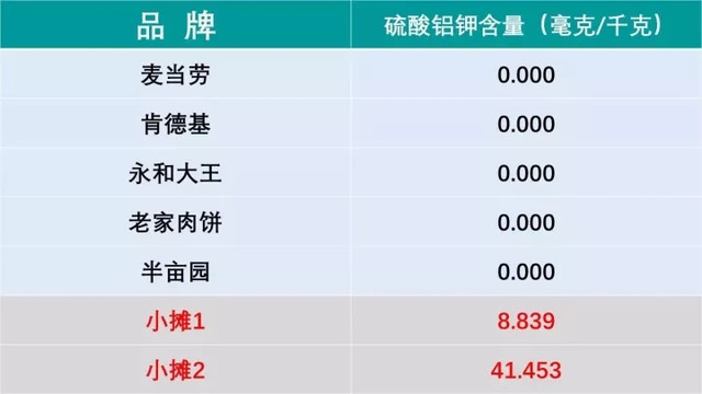 記者了解到,永和大王自稱“非礬油條”,肯德基自稱“安心油條”,在本次檢測(cè)中均名副其實(shí)。而來(lái)自兩個(gè)路邊攤的油條均被檢出含鋁,含量分別為8.839mg/kg和41.453mg/kg,但均未超過(guò)國(guó)家標(biāo)準(zhǔn)規(guī)定的100mg/kg。