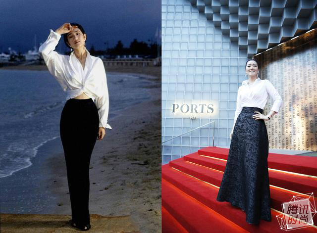 鞏俐1993年在戛納海灘前的寬大白襯衣搭配及地黑裙,明明才二十幾歲的年紀,卻已經有了修煉千年的穿衣氣質,二十多年來勝卻人間妖孽無數。