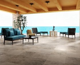 (陽臺(tái)設(shè)計(jì),地面采用歐神諾卡薩羅卡圖系列ECB10460GY瓷磚)