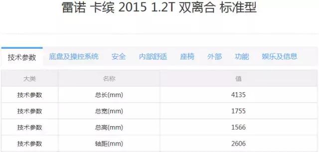 新車參數(shù)配置,跟現(xiàn)款車型也沒有很大區(qū)別。對(duì)此,達(dá)示數(shù)據(jù)附上雷諾卡賓 2015款 1.2T 雙離合標(biāo)準(zhǔn)車型部分參數(shù)配置表,以便大家參詳。