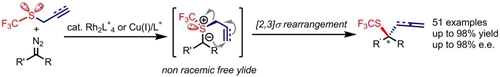 除了過渡金屬催化的卡賓偶聯(lián)之外,該課題組最近在金屬卡賓反應(yīng)的立體選擇性控制研究中也取得重要進(jìn)展,實現(xiàn)了高對映選擇性的硫葉立德[2,3]-sigma重排反應(yīng)(Doyle-Kirmse反應(yīng)),建立了不對稱三氟甲硫基化的新途徑。三氟甲硫基(SCF3)由于具有獨特的電子性能、高穩(wěn)定性以及高親脂性,在藥物設(shè)計及研發(fā)中的重要性日益增加。近年來,如何高效地在藥物分子的合適位置引入三氟甲硫基受到了人們的關(guān)注。雖然三氟甲硫化的相關(guān)合成方法學(xué)已經(jīng)取得了重要進(jìn)展,但如何對映選擇性地引入三氟甲硫基依然存在著諸多挑戰(zhàn)。