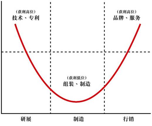 在這條曲線中,產(chǎn)業(yè)鏈中的附加值更多地體現(xiàn)在研發(fā)設(shè)計和營銷銷售兩端,而處于中部的制造業(yè)則屬于企業(yè)可獲取價值最低的部分。
