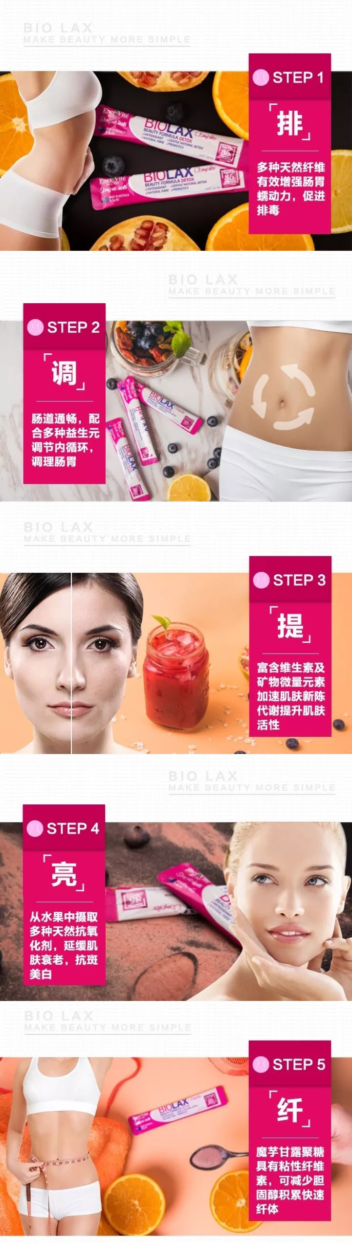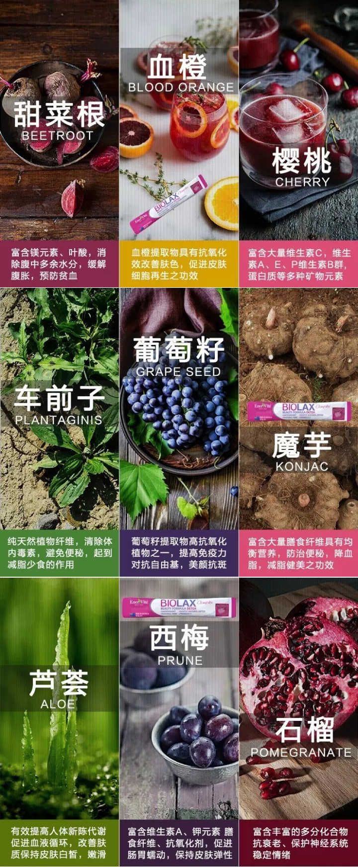 這一款產(chǎn)品是廣大愛(ài)美一族的福音,集排毒瘦身、科學(xué)減肥、腸道健康、美白抗氧化四大功效于一身。EnerVite澳樂(lè)維他作為澳洲口碑最好的保健品牌之一,始終把安全放在第一位,“小魔包”Biolax里面含有蘆薈、西梅子、甜菜根、魔芋、針葉櫻桃、洋車前子、血橙、葡萄籽和石榴九種有助于瘦身排毒及強(qiáng)效抗氧化的純天然蔬果提取物,能夠有效為身體排毒并提升自身免疫力、促進(jìn)身體新陳代謝,同時(shí)補(bǔ)充更多維生素和益生元,美容養(yǎng)顏,調(diào)理胃腸功能,全面提升身體機(jī)能。沒(méi)有一絲傷害,不添加人工色素、防腐劑等成份。