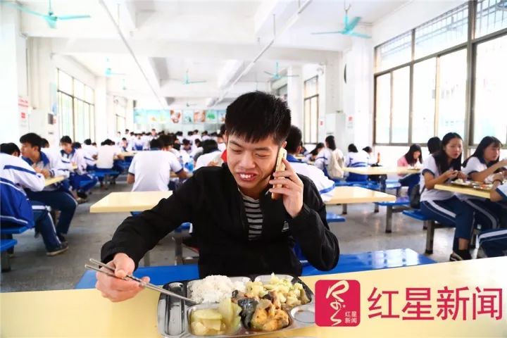梁智濱回到學(xué)校后成為了紅人,在食堂吃飯時(shí)也不斷接到電話。圖片來源紅星新聞