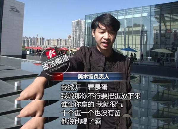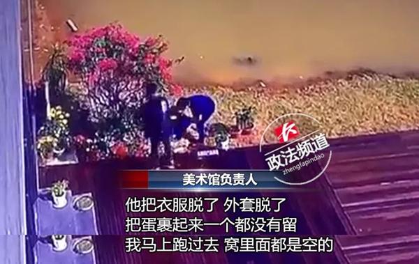 初步認(rèn)定剛從身旁跑走的藍(lán)衣男子可能是偷蛋賊后,美術(shù)館負(fù)責(zé)人立即追了上去將男子攔下,此時,男子手中正抱著一堆東西。