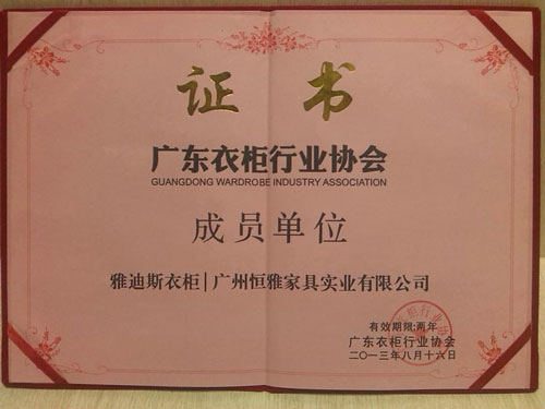 ATIS雅迪斯榮獲“廣東衣柜行業(yè)協(xié)會成員單位”-證書